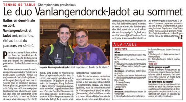 Ce dimanche se déroulait les Championnats Provinciaux en double à Bastogne. Battus en demi-finale en 2016, la paire Pierre-Julien Jadot et Benoît Vanlangendonck ont cette fois remporté le titre en série C !