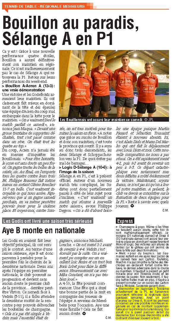 Bouillon qui assure son maintien en Régionale et Sélange qui descend en P1. Et si Biermonfoy rejoignait la Régionale 20 ans après l’avoir quittée ?