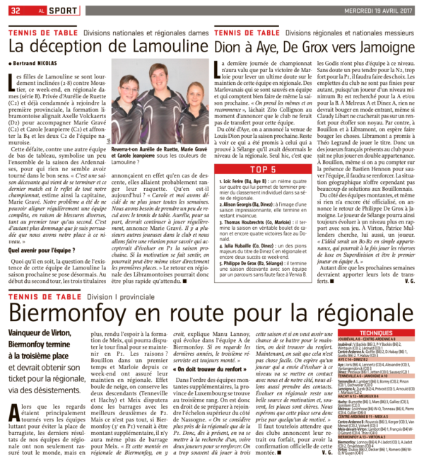 Biermonfoy en route vers la Régionale. Ce n’est plus une probabilité mais une fait ! En effet, nous appris ce jour l’ordre des réserves : Hainaut-Luxembourg-Liège-Namur-BBW. Le Hainaut monte (4 descendants francophones de Nat 2 et donc une place de libre). Luxembourg monte au vu de la descente de Châtelet B donc actuellement Liège est 1ère réserve et Namur 2ème. Suivi de BBW-H-Lx…