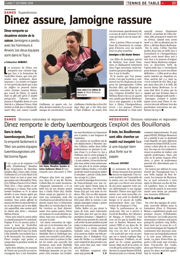 Tous les résultats de nos clubs en Superdivision, Nationale et Régionale. En régionale, notre équipe A, avec un Pascal Lambert diminué, s’incline 6-10 contre Palette Bon-Secours B.