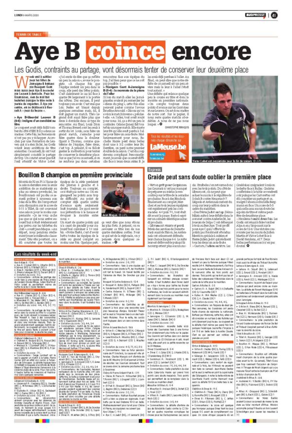 Revue de presse par Gaël Lardot | Mar 10, 2020 | Presse | 0 commentaires Tous les résultats de nos clubs en Nationale, Régionale et Provinciale ici. La Meuse du Luxembourg – 09/03/2020 Poster le commentaire Annuler la réponseVous devez vous connecter pour publier un commentaire.